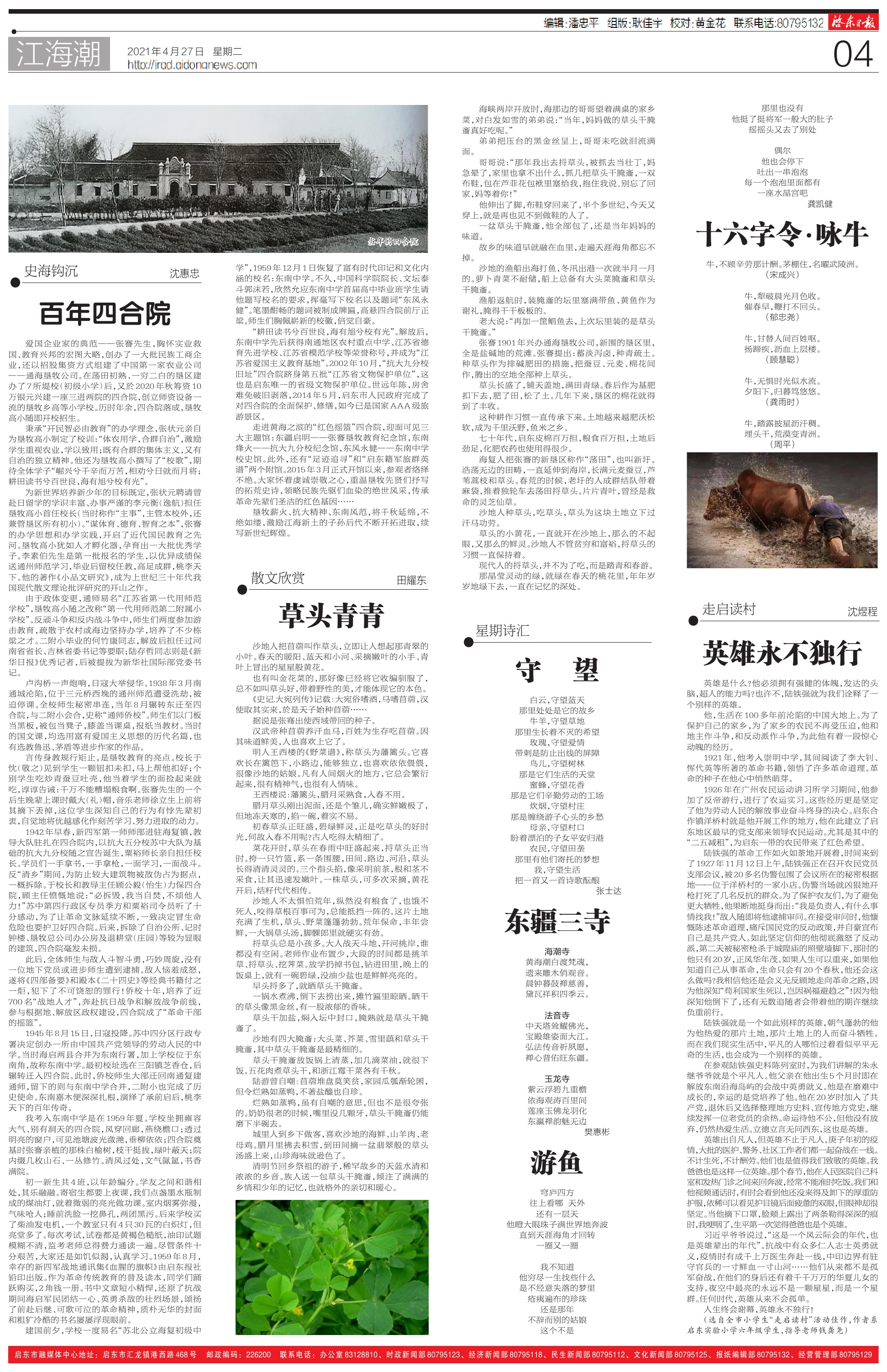 海复人把张謇的新垦区称作“荡田”,也叫新圩。浩荡无边的田畴,一直延伸到海岸,长满元麦蚕豆,芦苇蒿枝和草头。春荒的时候,老圩的人成群结队带着麻袋,推着独轮车去荡田捋草头。片片青叶,曾经是救命的灵芝仙草。