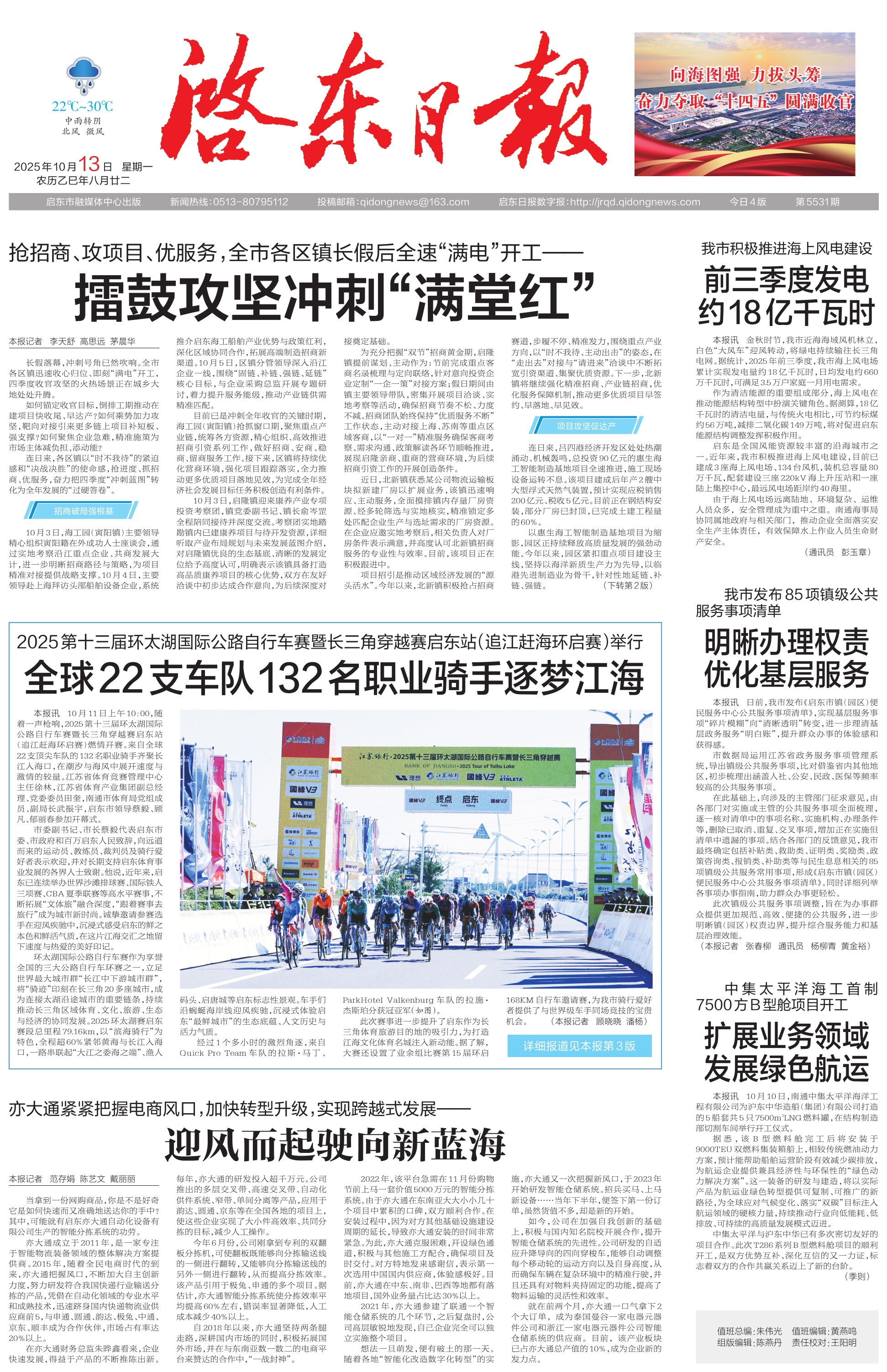 环太湖国际公路自行车赛作为享誉全国的三大公路自行车环赛之一,立足世界最大城市群“长江中下游城市群”,将“骑迹”印刻在长三角20多座城市,成为连接太湖沿途城市的重要链条,持续推动长三角区域体育、文化、旅游、生态与经济的协同发展。2025环太湖赛启东赛段总里程79.16km,以“滨海骑行”为特色,全程超60%紧邻黄海与长江入海口,一路串联起“大江之委海之端”、渔人码头、启唐城等启东标志性景观。车手们沿蜿蜒海岸线迎风疾驰,沉浸式体验启东“最鲜城市”的生态底蕴、人文历史与活力气质。