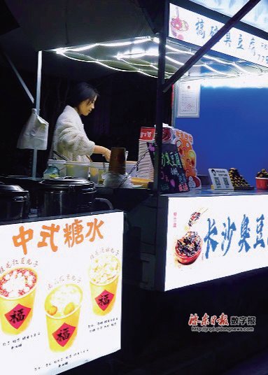 除了招牌臭豆腐,他们还增设了一个糖水小摊,为夜市增添了一抹甜。两人分工明确,却又默契十足,常常在忙碌中自然补位。“她炸豆腐时,我就在旁边备料、递东西,高峰期我们俩像打仗一样,配合起来反而干劲十足。”张健波笑着说。